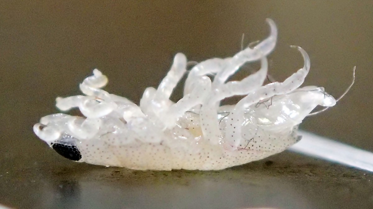 種類不明。2025年4月下旬に河口付近で採集した「メジナの稚魚」(全長約2cm)の左のエラに寄生していたもの。ただ写真は、寄生されていた「メジナの稚魚」を46日飼育した後にエラから取り外したものなので、初めはもっと小さかったと思われる(メジナの成長に合わせて寄生虫も大きくなっていった)。