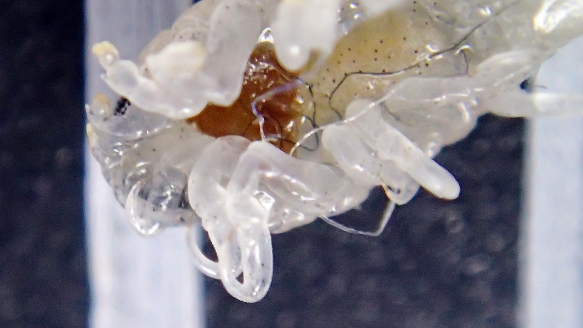 (写真:2025年4月下旬に採集した「メジナの稚魚」のエラに寄生していたもの。体長約4mm。生きた状態で撮影。んー似ている…アイツに似ている…)