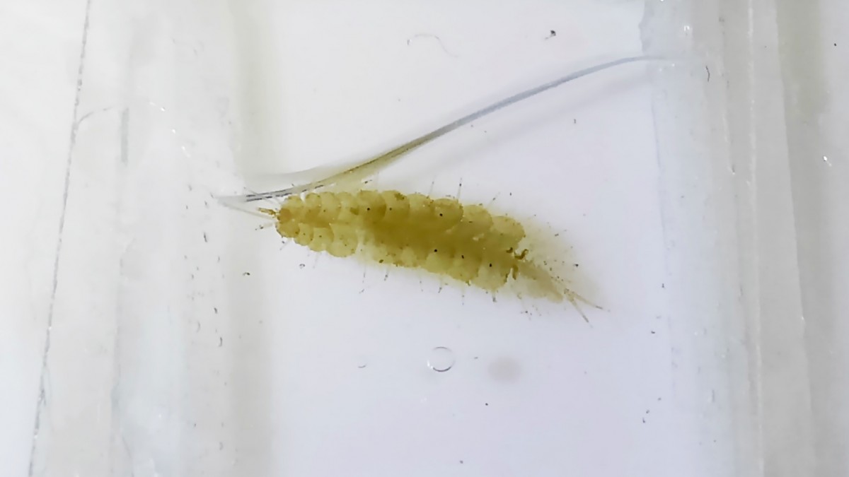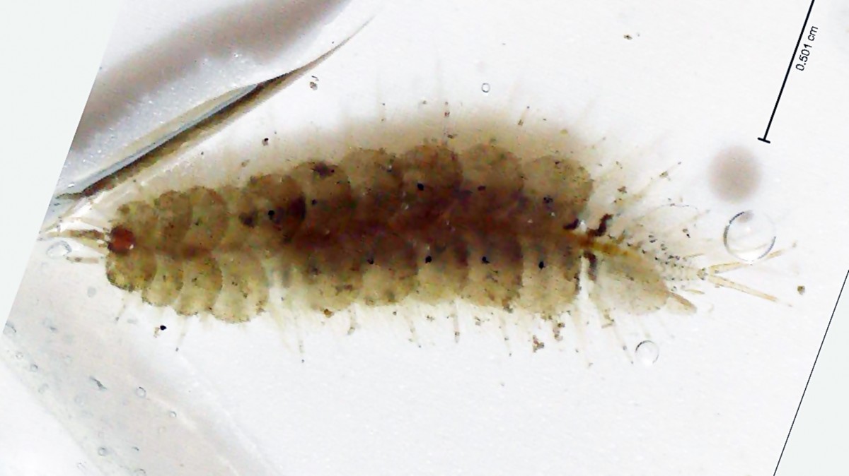 写真のウロコムシは薄い黄土色をした半透明の丸いウロコを12対前後持ち、頭部と尾部に触手?が数本ずつ見られる。またウロコの中心近くに小さな黒点が1つある。