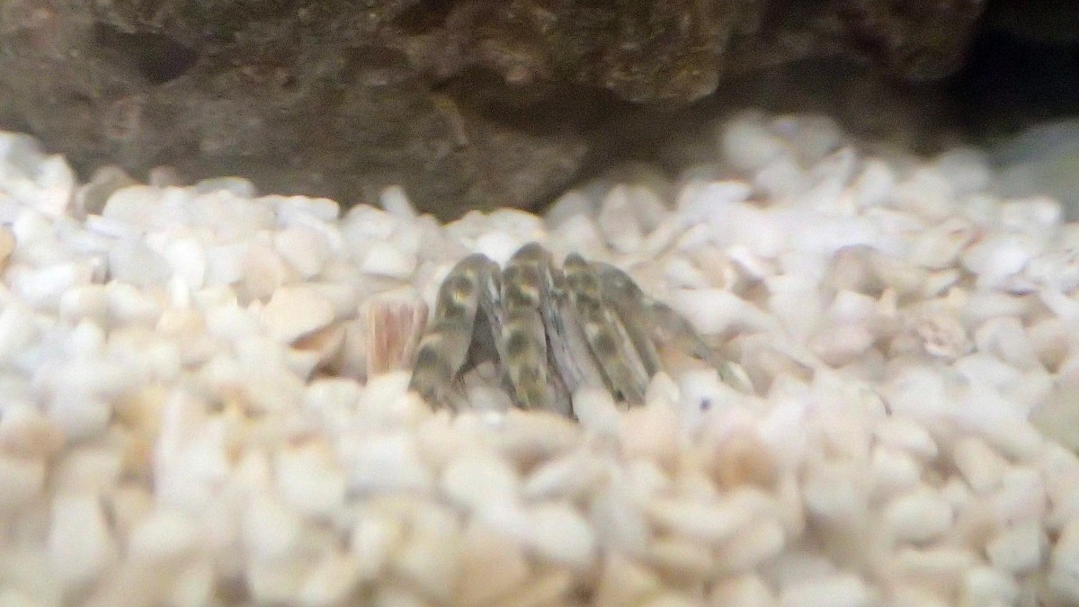 ところが3回目、底砂に田砂を敷いた他に生物の入っていないサブ水槽に入れたところ、1ヶ月以上生存している(ちなみにオス個体1匹のみ)。基本的には砂に潜っていることが多いが、部屋を暗くすると砂から姿を現し、砂を口に運ぶ動作をしていた。