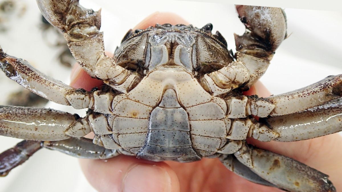 (写真:2024年3月中旬、三番瀬で採集。甲羅の幅約5.5cm。オスのモクズガニ)