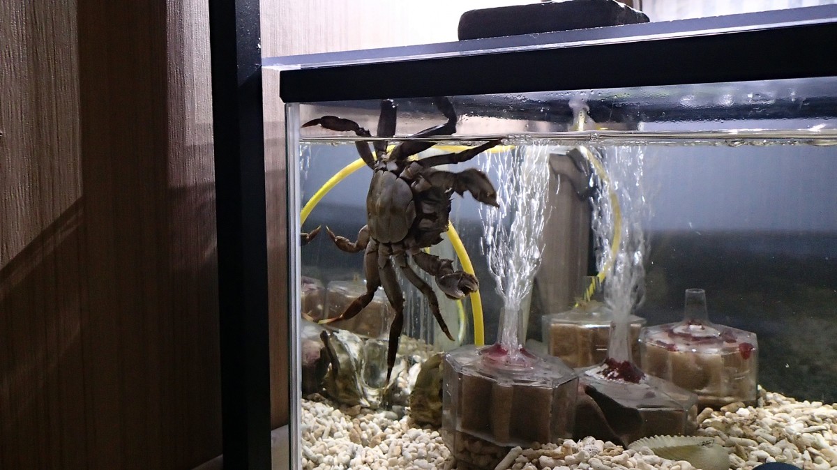 まずは水合わせ。過去に、同じ場所で採集したモクズガニ(オス)を泥抜きのため水道水に一晩浸けたところ翌朝に死んだという失敗から、合わせは慎重に慎重に行う(2時間ぐらいかけたかな)。