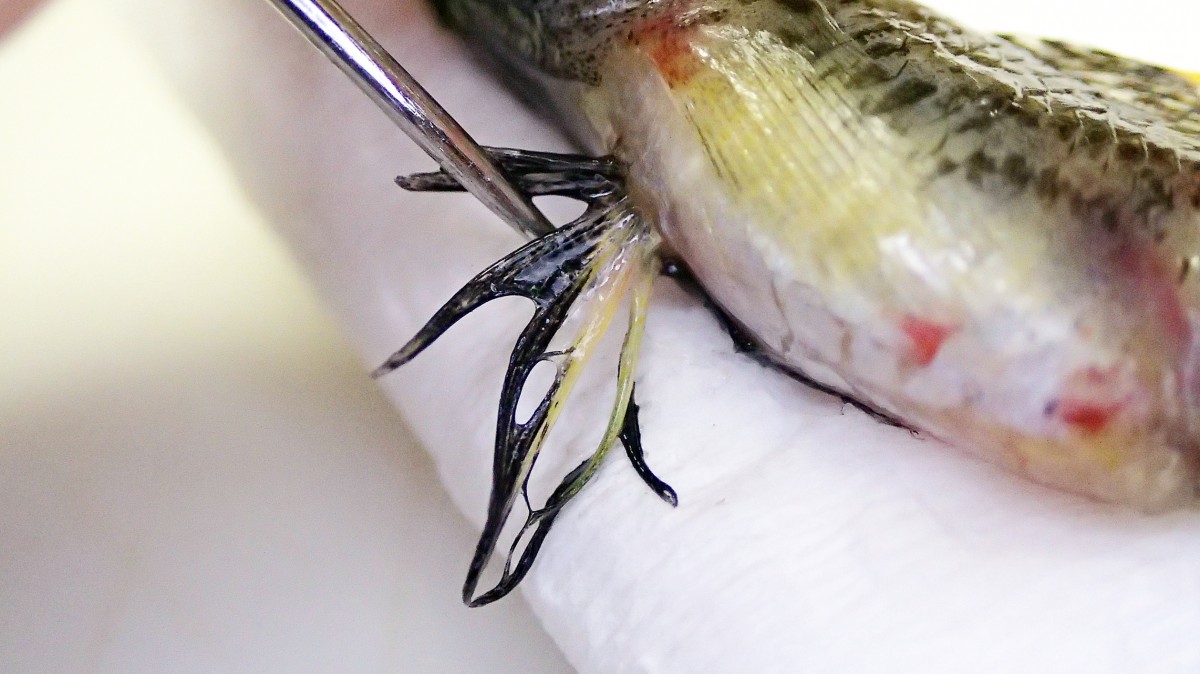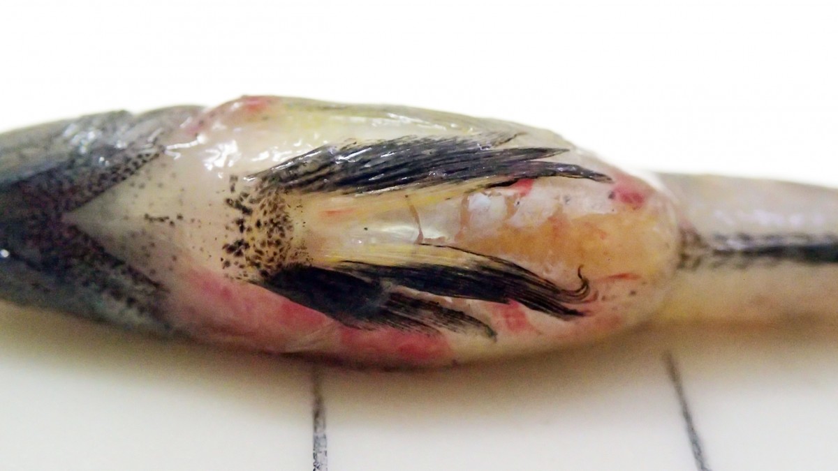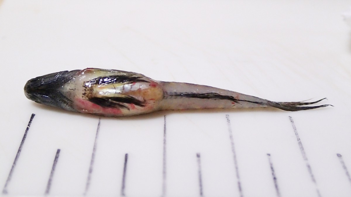 (写真:2025年9月中旬、三番瀬で採集(採集したのは私ではない)。全長約5.5cm。死後約1時間後に撮影。おそらく雌で婚姻色が現れている個体だと思われる。お腹がパンパンなのは卵だろうか?)