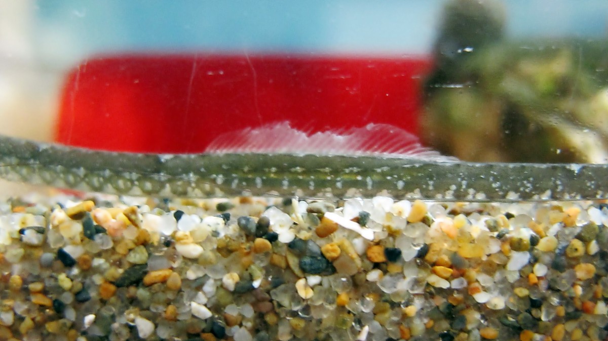 何となく繊細なイメージがあるヨウジウオだが、性格は堂々と?していて、キューブ水槽内の砂地には「マコガレイの幼魚」と「マゴチの幼魚」が3匹いたのだが、そいつらの上に乗るかのようにして砂の上に鎮座していた。また私が見た限りでは他魚を攻撃することもなかった。