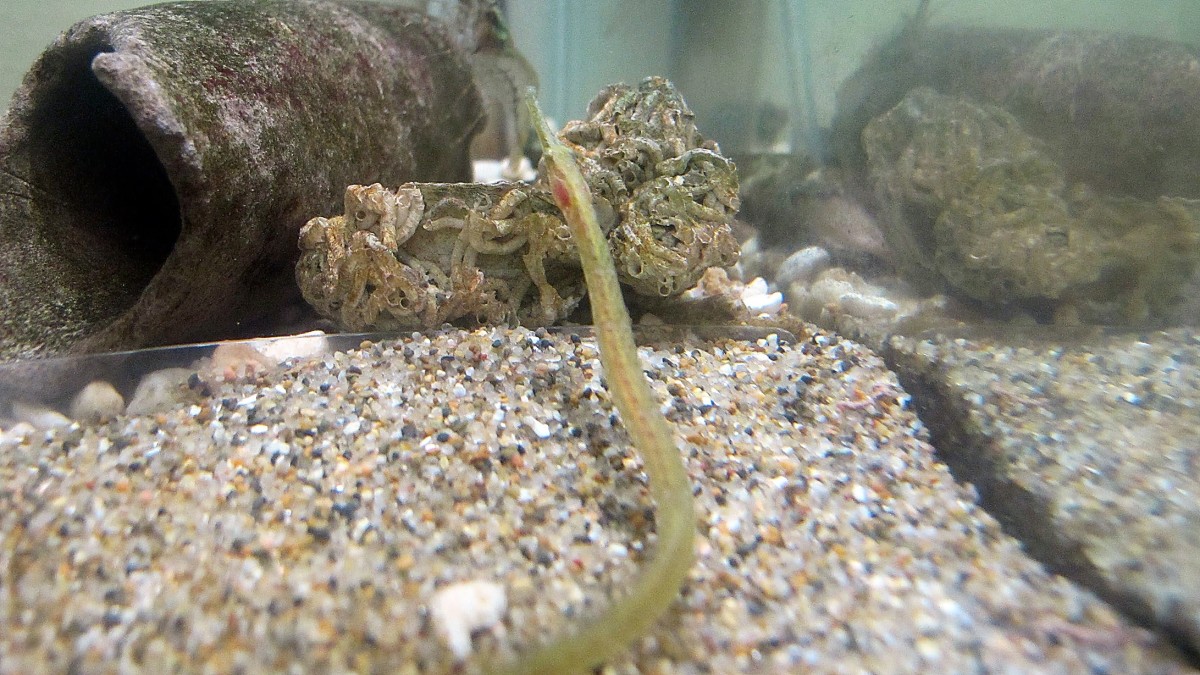 (写真:自宅水槽の砂の上に鎮座するヨウジウオ。水槽に入れてしばらくすると、体色が黄色っぽく変化した)