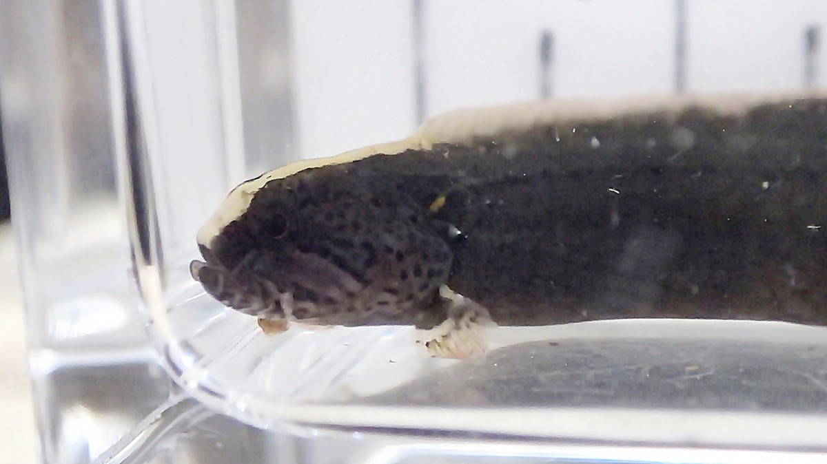 背びれと尻びれはそれぞれ尾びれにつながっており、1つのひれのように見える。腹びれもあるらしいが退化的で目立たないそうだ。また体側に側線が背中から腹側へ縦方向に走っているという特徴を持ち、それらがシワのように見え、どこか爬虫類チックな雰囲気を醸し出している。