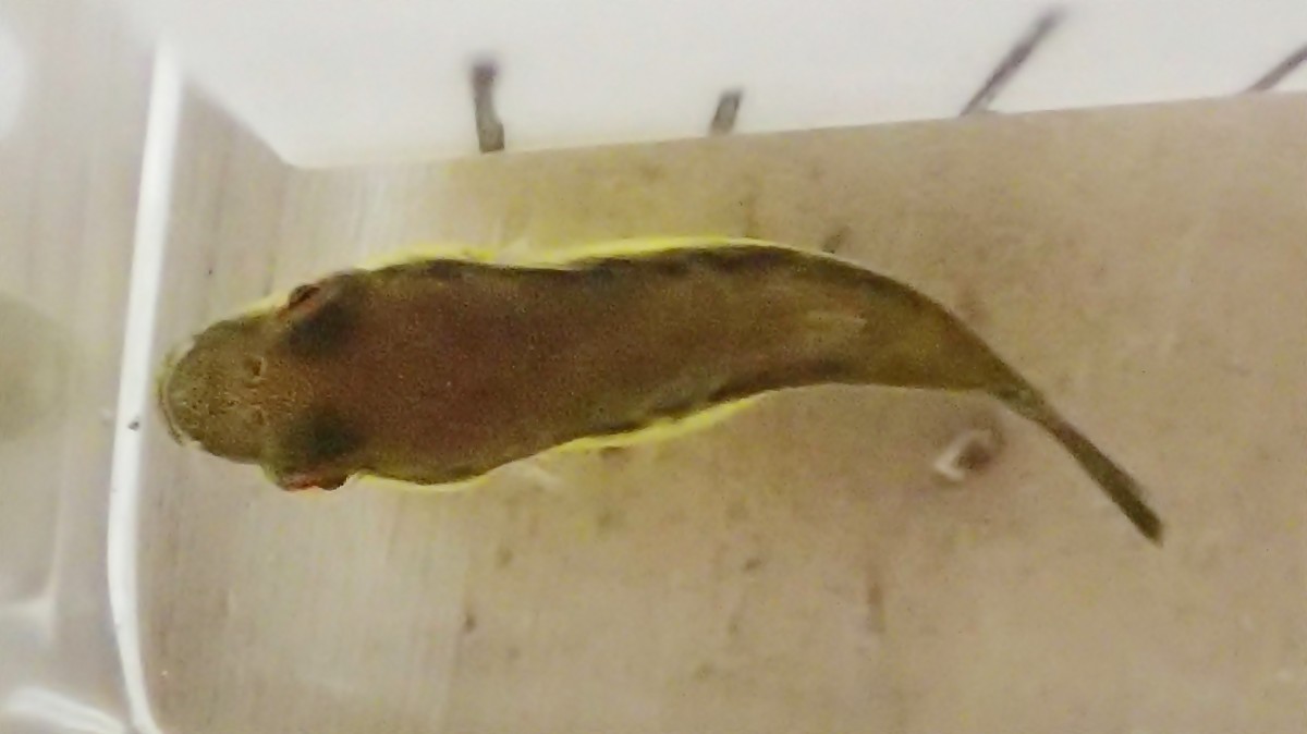 さて採集したフグの幼魚だが、背側~体側の半分あたりまでが褐色で、腹側黄色味の強いシャンパンゴールド。そして上アゴ側面~体側の真ん中を通り、尾柄部の手前までに黒く太い帯模様が走っている。ひれは胸びれ、背びれ、臀びれはほぼ透明で、尾びれは黒色で一部黄色い部分もある。また眼は黒目の周りが暗赤褐色をしている。