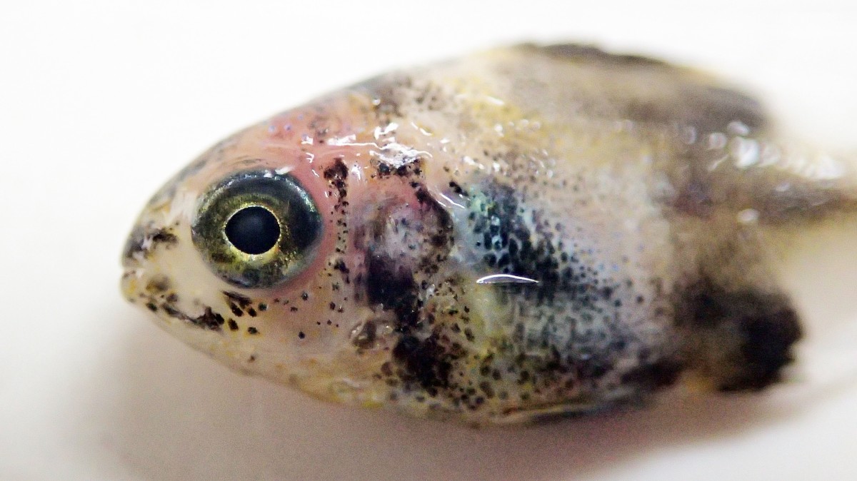 (写真:2024年5月下旬、三番瀬で採集。全長約1.5cm。死直後に撮影。カゴカキダイの稚魚…かもしれない。体色や体型、体の模様に「カゴカキダイの幼魚」の面影があるが…いかに)