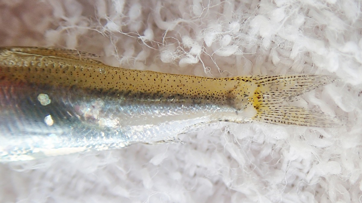 「6月なのに暑すぎるだろ…」と水面を眺めていると、視界に全長7cmほどの平たい魚の群れが飛び込んで来た。魚体の背には寄生虫らしきものが見える。
