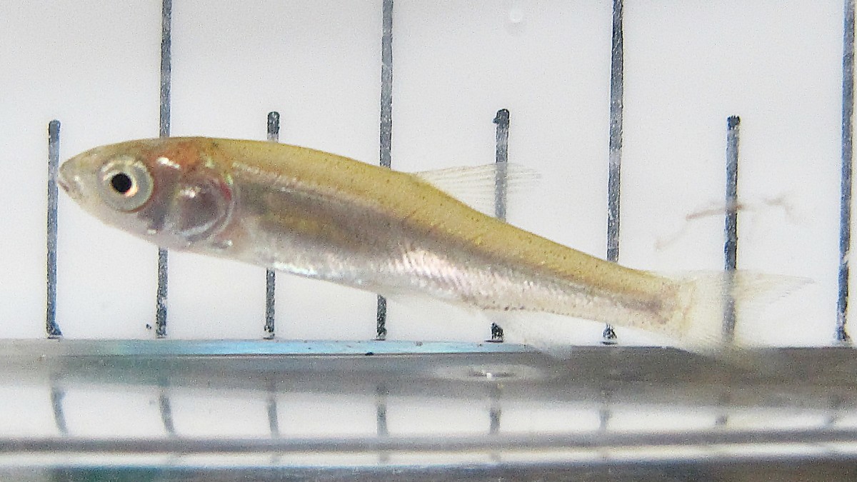 (写真:2020年6月下旬、河口付近採集。全長約3.5cm。「ウグイ」の幼魚…かもしれない(全く自信はない)。「ウグイ」というと川魚のイメージがあるが、この幼魚は河口付近で採集した。目盛りは5mm)