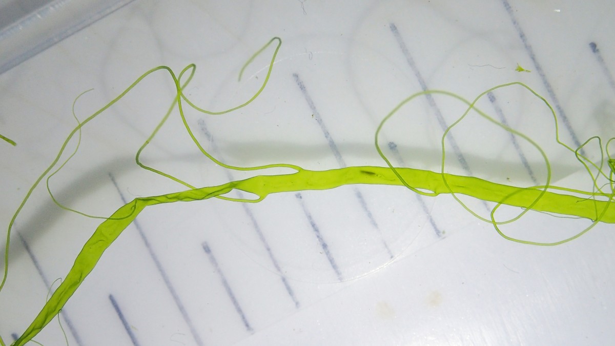 (写真:2025年2月下旬、浦安市内河川下流域で採集。長さ約10cm、幅約3mm。おそらくこれは藻体の上端と下端がちぎれてしまっているもので、本来はもっと長さがあったのでは考えている。目盛りは5mm)