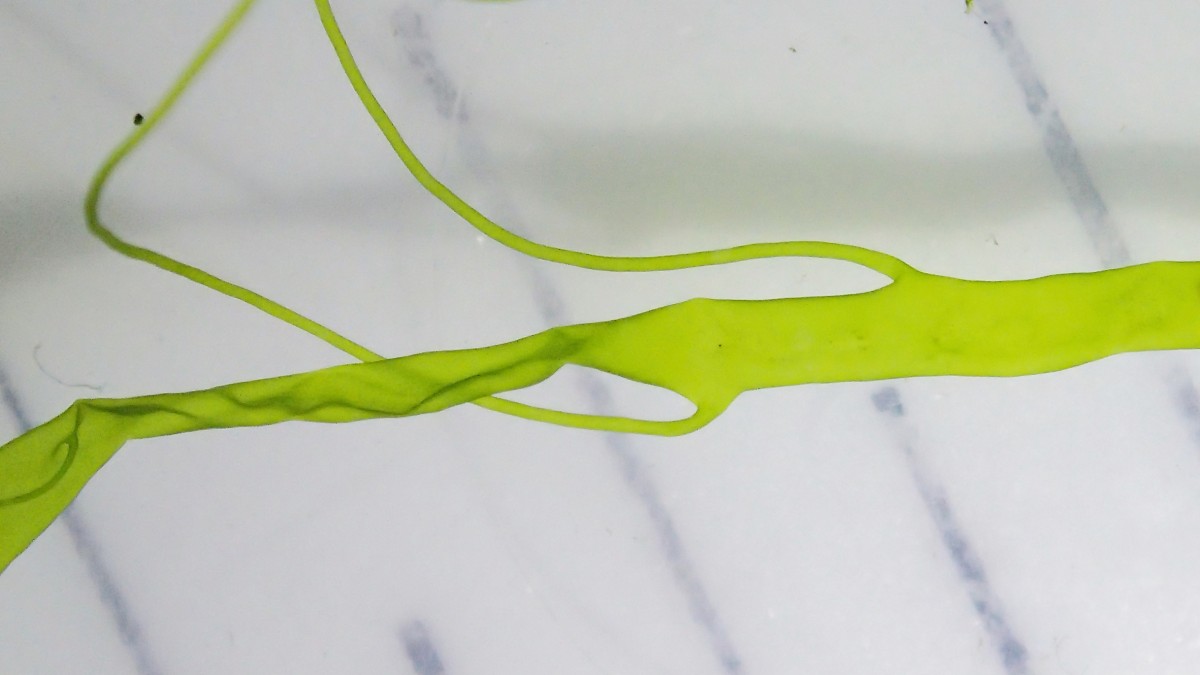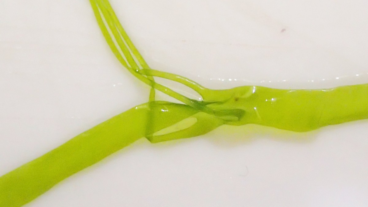 そのスジアオノリ?のようなものの中で一番長いもの取り出し観察してみる。長さは50cm程度あるが、上端と下端がちぎれてしまっているようなので元々どれくらい長かったのかは分からない。幅は3mmあるかないかといったところで、