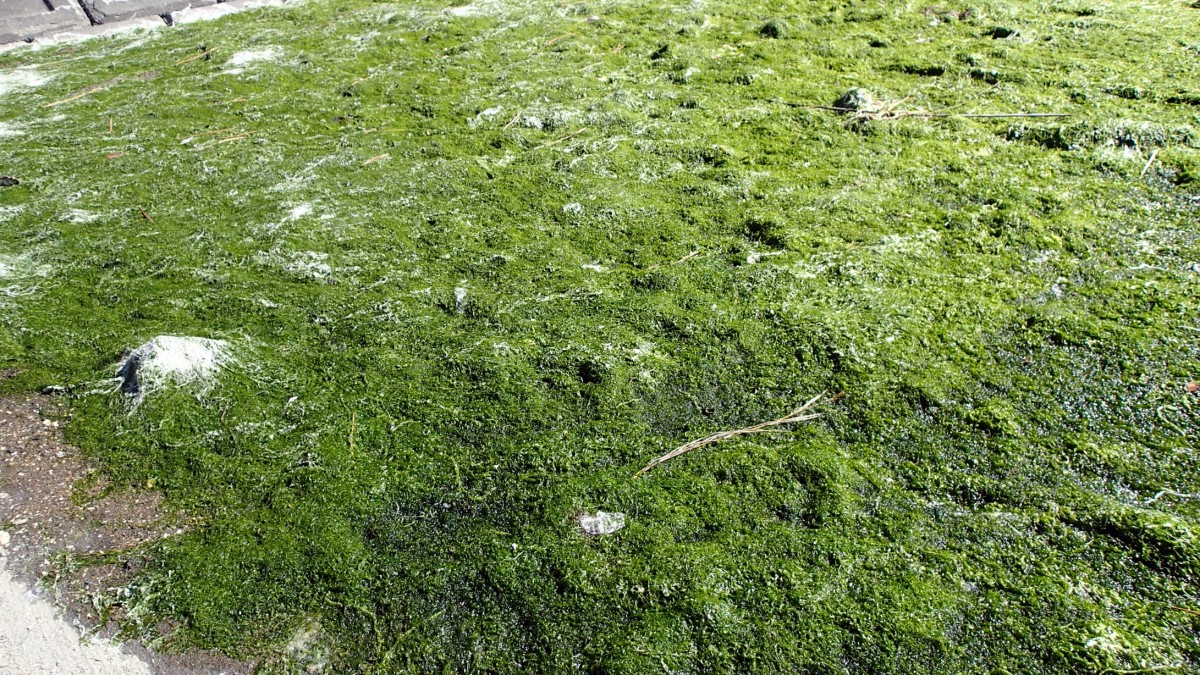 今回の採集時も潮が引いており、辺り一面アオサ類による”緑の絨毯”状態になっていた(下の写真)。また長時間の干出のためか、藻体が白く変色しているものもチラホラ(下の写真)。