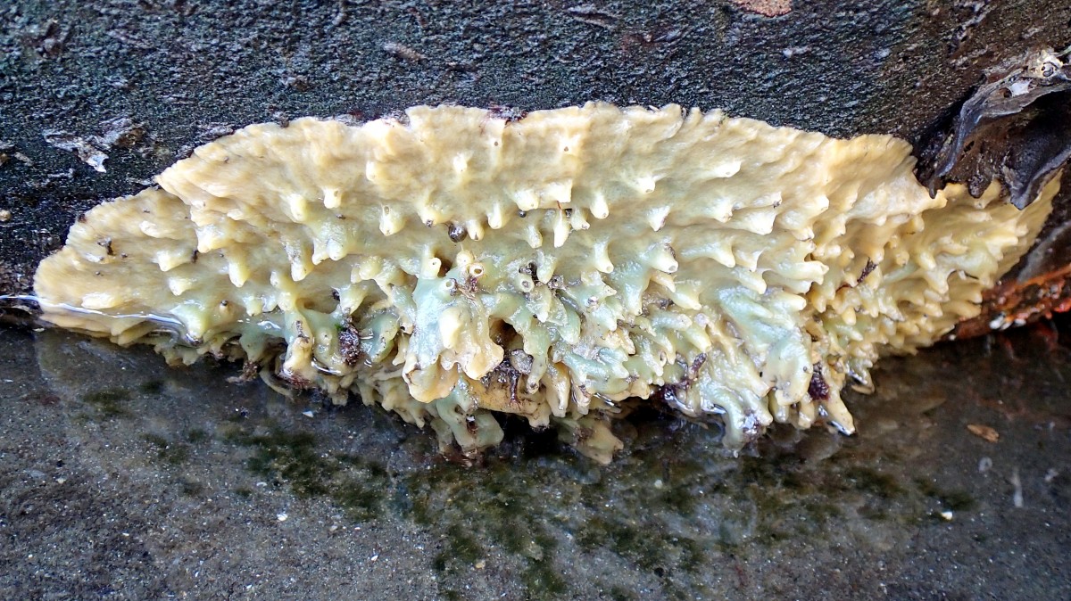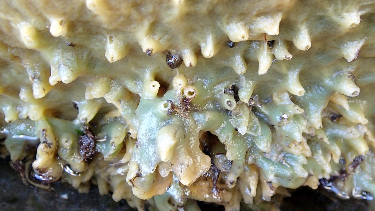 「ダイダイイソカイメン」と並び、日本の海岸でよく見られるカイメンの一つ。潮間帯(ちょうかんたい。潮の満ち引きにより水没と露出を繰り返す場所のこと)から水深550mまで幅広い環境に生息するカイメン。浦安では海に面した場所の岩やテトラポットに付着しているのをポツポツ見かける。