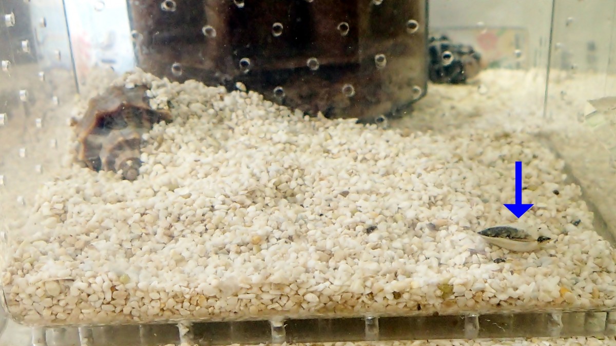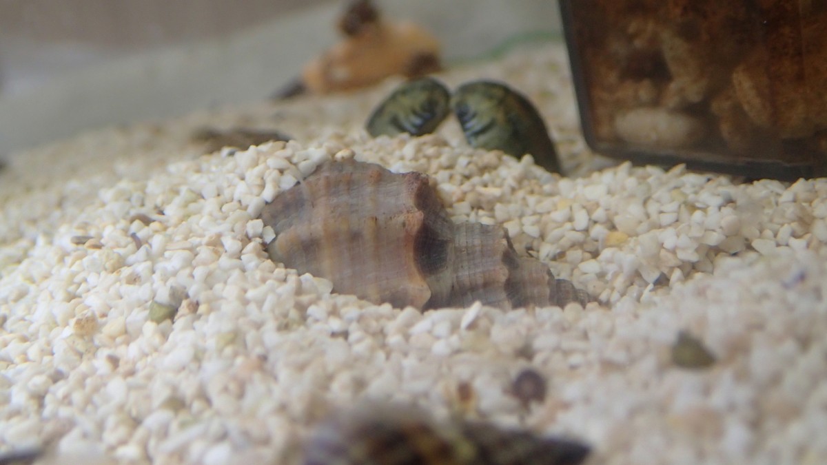 先にも書いたがこのコロモガイ、飼育を開始して1ヵ月以上エサを食っているシーンを目撃できていなかった。だが実は前々から砂中でひっそりと「ウミニナ」の体液を吸って生きながらえていたのかもしれない。しかも吸われた方の「ウミニナ」も死ぬわけではないので尚更気が付かなかった…?