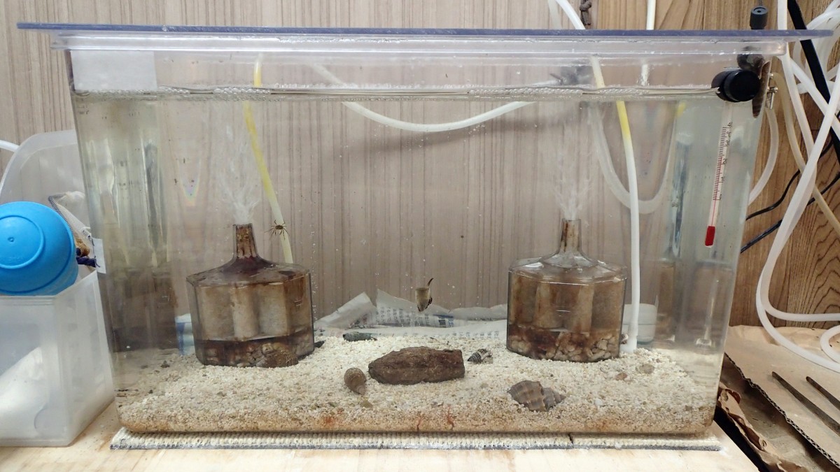 一度換水の間隔を2週間まで延ばし、水面に泡が残らなくなるような状態まで水質が悪化したが、それも乗り越えた。水温も20℃~25℃まで上昇したが、大きな問題は無さそうに見える(採集時の海水温は15℃ほど)。