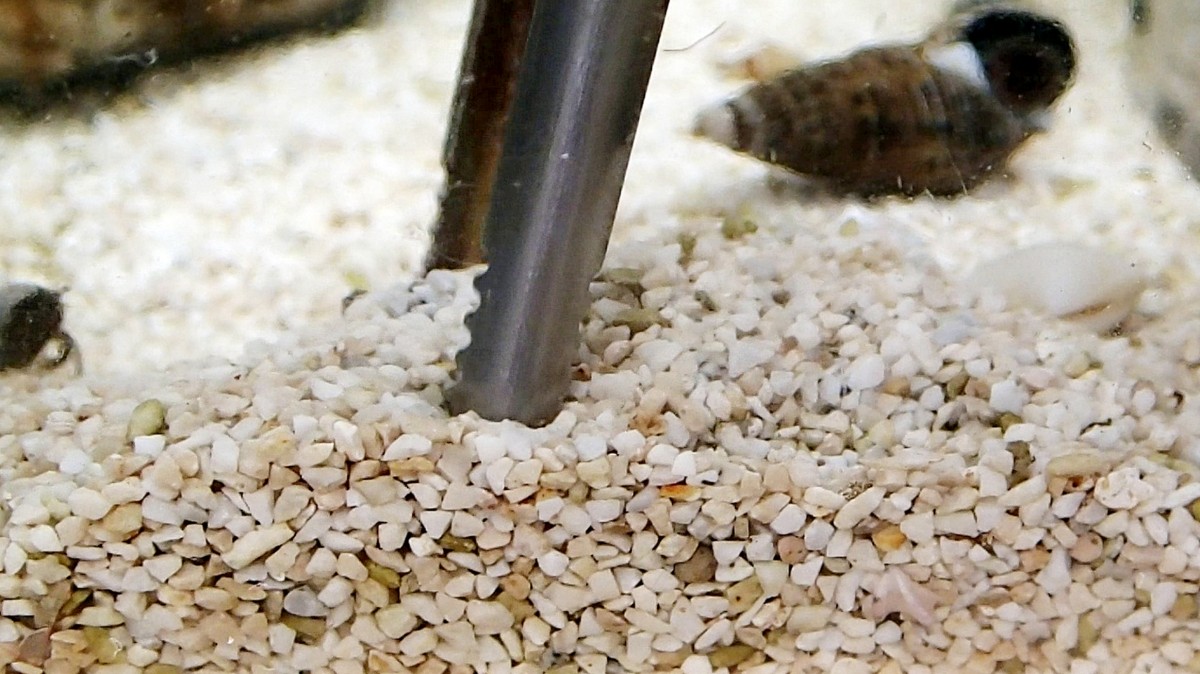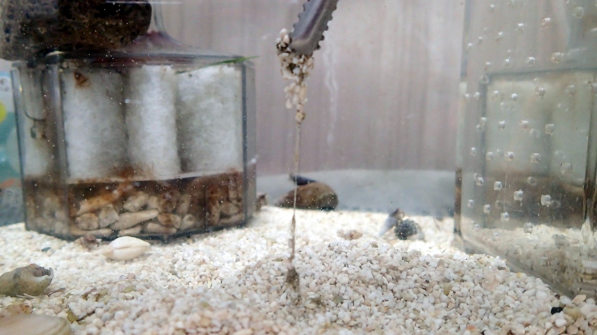 もしかしたら水槽の底砂の中にいる何かを食っているのか? 底砂内にいる軟体系の生物で数が多いのはアイツだ。正体不明のヒモムシ軍団である。このヒモムシたち細長くて非常によく伸びまたヌルヌルしていて、蕎麦のようにずるるっといけそうだが、何となく他の生物たちから忌避されている印象がある…。
