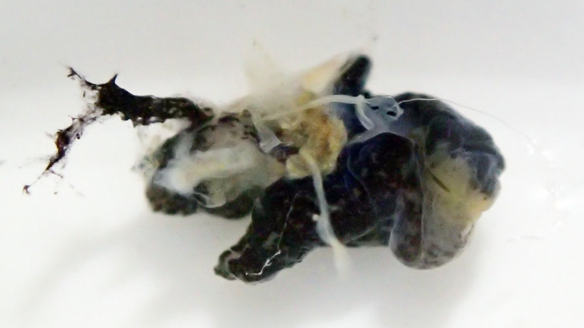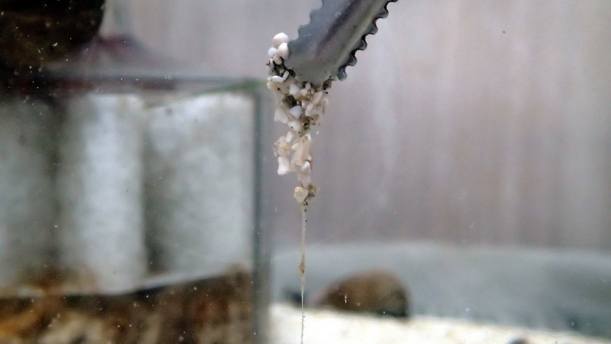 さらにコロモガイを飼育しだしてしばらく経ったとき、底砂の中の生物をピンセットで取り出す作業をしていたら、コロモガイが出したと思われる粘液の塊が出るわ出るわ…。