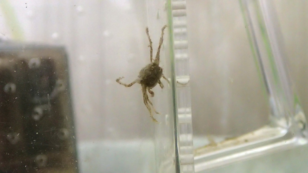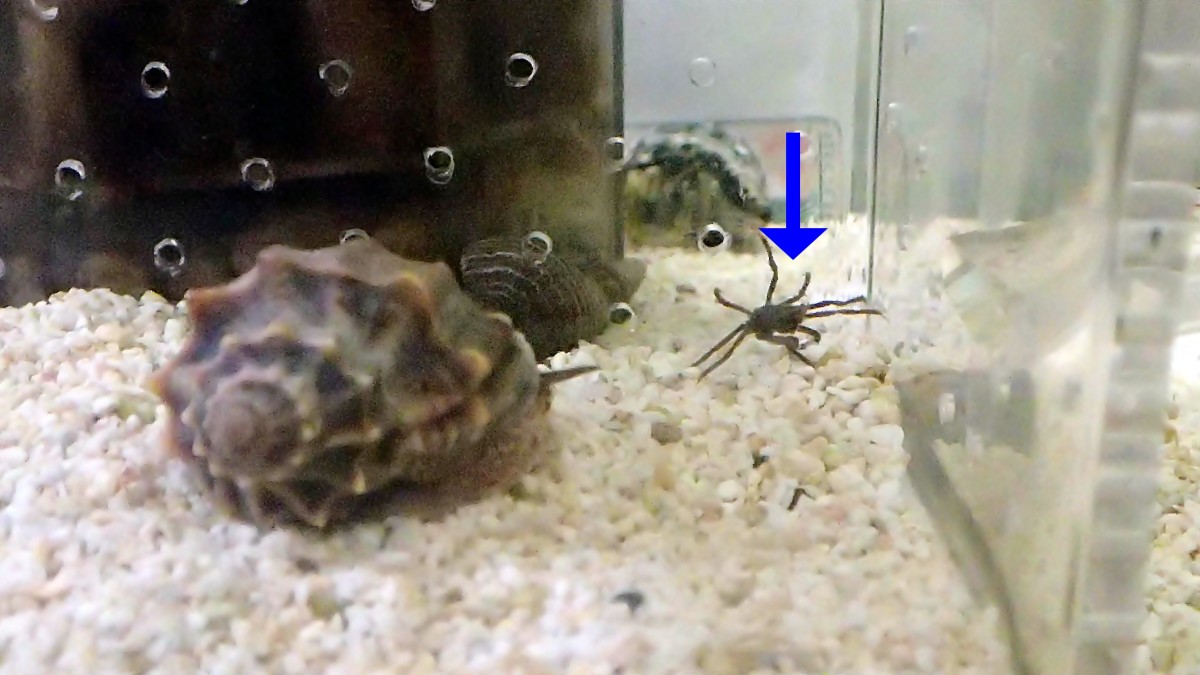 軟体動物以外も試してみよう。動きが速くなく攻撃性の低いものなら…ということで小型の「イッカククモガニ」で実験してみた。一応コロモガイが採集された場所にも生息しているカニだ。