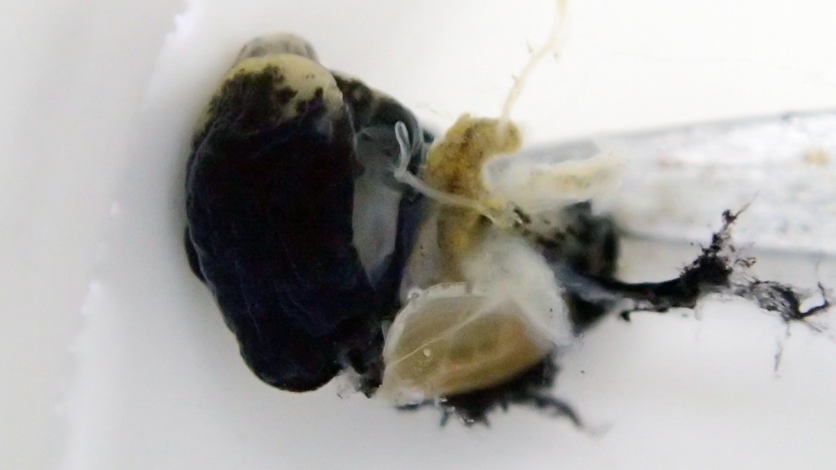下の写真を見てもらうと分かるが、体の背面後部が大きく破れている。噛みつかれて表面だけ引き剥がされたされたような感じ。昨晩まで元気一杯だったので実験ケースに侵入してきた別の小さな生物による攻撃とは考えにくい。