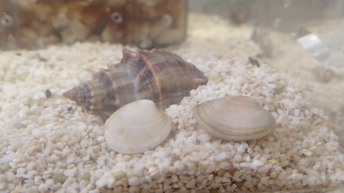 先の「アサリ」の結果があるので期待は少ないが、「ヒメシラトリ」はコロモガイと同じく干潟などに生息する潮下帯種! 殻も薄いしもしかしたら…!? と実験をすることに。今回は「ヒメシラトリ」と「ホンビノスガイ」の稚貝の2種を同時にケースに入れた。