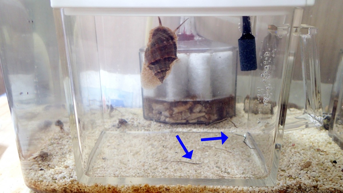 (写真:青矢印がヒモムシの一種たち。気が付いたらこの水槽の底砂内に結構な数が住み着いていた)