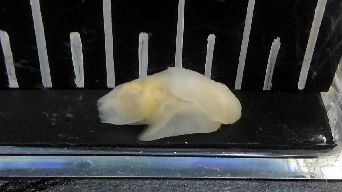 実験2発目にして大本命の登場。体長10mmほどのキセワタガイの一種だ(おそらく「ヤミヨキセワタ」か「タソガレキセワタ」ではないか?とのこと)。
