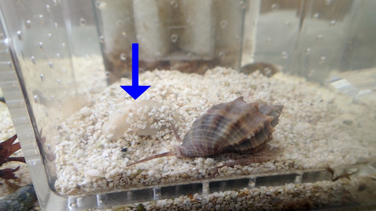 (写真:青い矢印が謎の卵塊である。直径1.5cmほど)