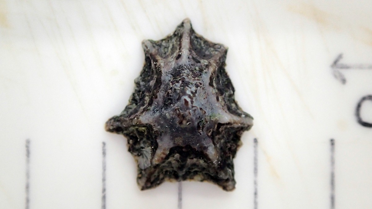 (写真:2024年6月中旬、三番瀬浦安側南東のテトラポッド帯で採集。殻長2.4cm、殻幅2cm、殻高1cm。たしかに「鵜の足」っぽい見た目だ。以下、写真によって貝殻の様子が違って見えるが、このページ内のウノシタの写真は全て同一個体を撮影したものである。目盛りは1cm)